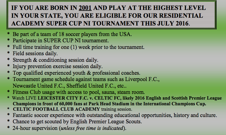 The flyer offers players daily training sessions, games at the Super Cup, a training session with Celtic and the opportunity to be scouted by English Premier League clubs. Who wouldn’t pay $2k to get scouted by Liverpool? Except they didn’t enter this year.
