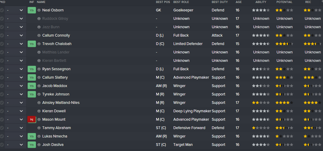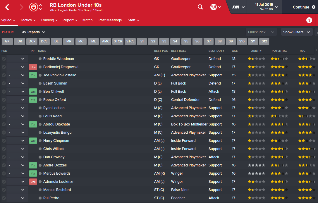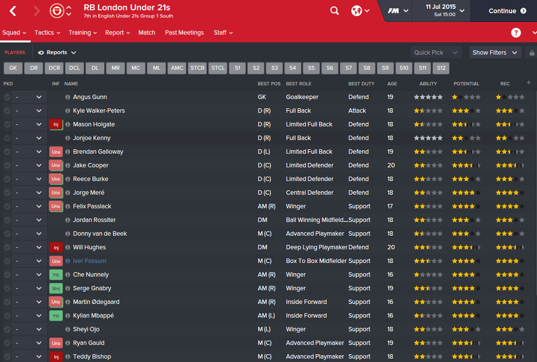 The first problem, none of the under 17 squad exist. This isn’t really a surprise, they would have been 14 or 15 in 2015 when the game begins. Not bringing in these players allows me to retain much of the Southampton youth squad and a few key older players.
