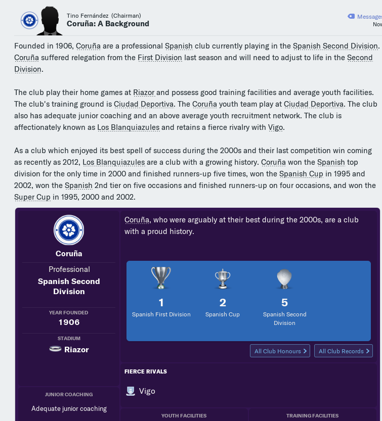 Armed with my FM19 crushing 4-4-2 system my aim is to bring Deportivo back to glory. To cast aside the giants of Madrid (both of them) and Barcelona to replace with not just a Super Depor, but a titan Depor, towering above said giants.