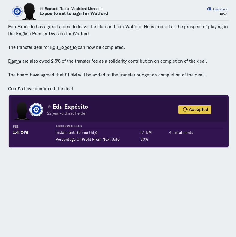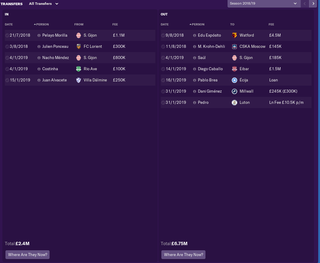 At the end of the season key loanees Adrian Ortola and Domingos Duarte were signed permanently for £1.3million and £2.2million, the fees written into their loan deals. Immediately their values more than doubled. Carlos Fernandez had an equally low fee in his deal but by this stage I had zero wage budget left and the board were not willing to give me more.