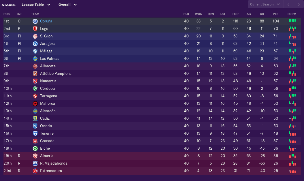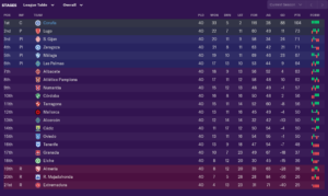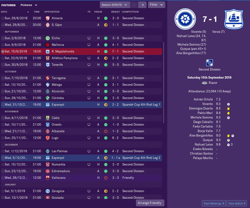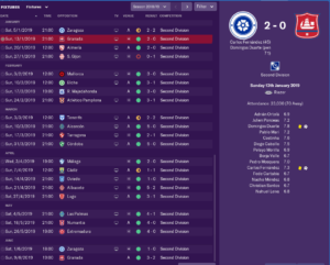 Winning 7-1 in the 5th league game of the season showed where this save would be heading. Thrashing Tenerife 5-0 two games later offered further confirmation. A 2-2 draw with top flight Espanyol helped affirm that this team wouldn’t be too far off the other lower ranked first division sides. Perhaps unsurprisingly for a team that was recently relegated. The second leg finished 1-1 and Super Depor crashed out on away goals. In the league the only blot pre-Christmas was a 2-1 defeat against Albacete. After Christmas Gijon would win 1-0 at the Riazor. From there on the wins were churned out, with the team developing a habit of turning relatively close games into comfortable wins during the last 25 minutes.