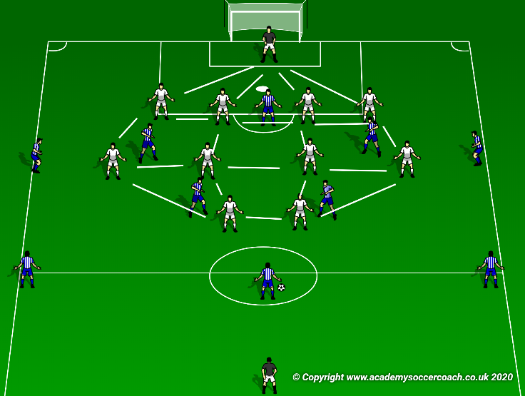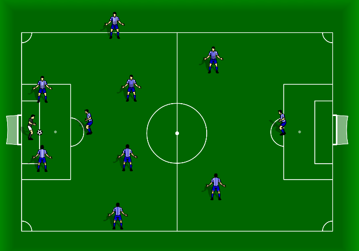 The goal kick provides teams an opportunity to create angles and distances to retain possession. Dispersing according to their own tactical preference. Out of possession the restart allows a team to form a defensive structure. The below might be used to counter press.