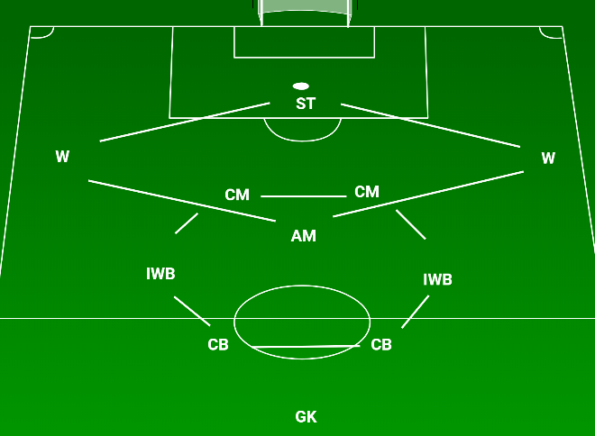 Using two holding midfielders and squeezing the central defenders together closes the space and allows the full backs to get further forward. The attacking midfielder can also exploit zone 14.