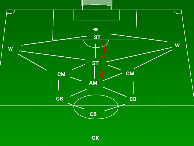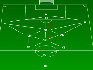 Finally, with movements from a striker and the attacking midfielder there is even greater integration of the two shapes. All of the shapes appear to like width close to halfway, but the wide players can easily drop to receive.